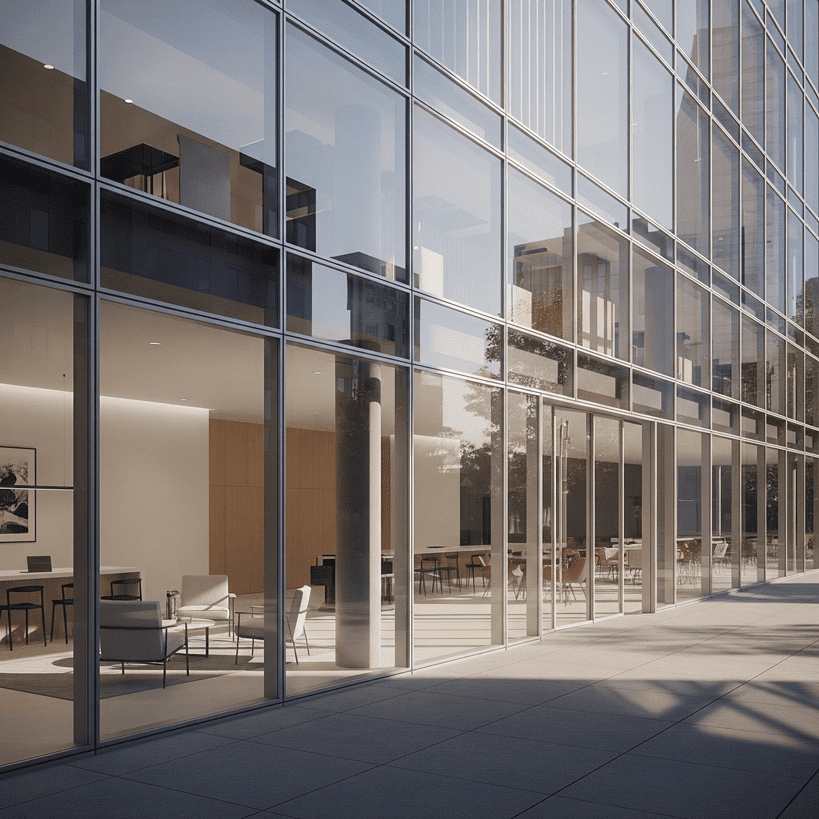 Instalasi fasad kaca modern untuk gedung, ruko, atau showroom.