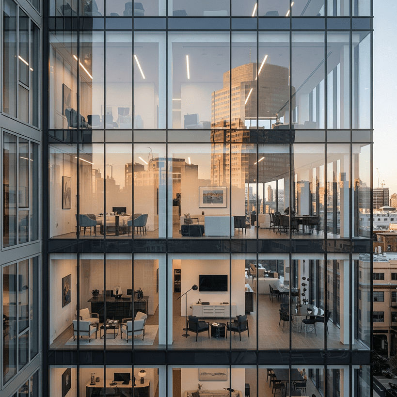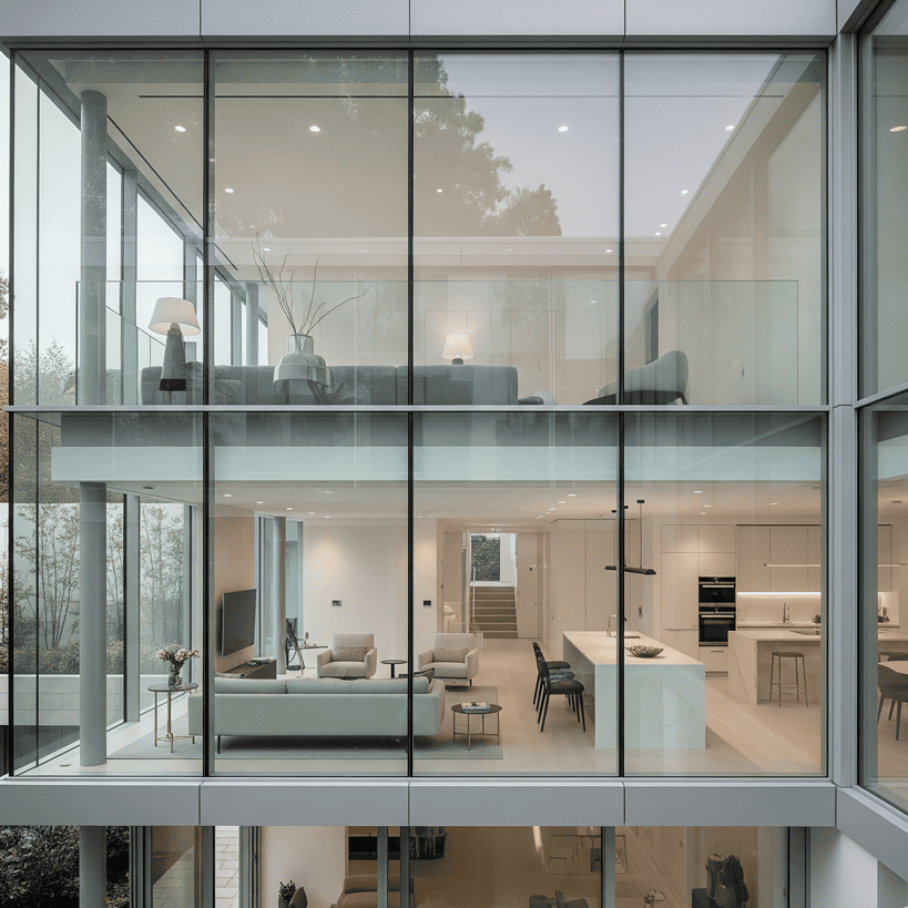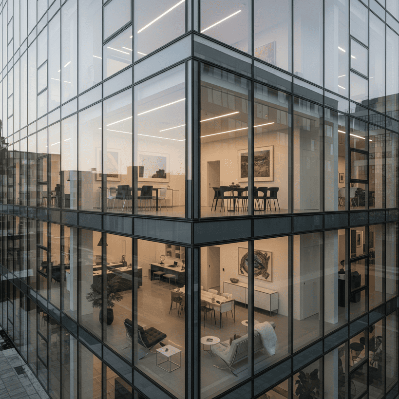 Fasad kaca (glass facade) memberikan kesan modern, profesional, dan terbuka. Tidak hanya meningkatkan estetika bangunan, tetapi juga membantu pencahayaan alami dan efisiensi energi. Ruang Alum Project melayani desain dan instalasi berbagai jenis fasad kaca untuk gedung perkantoran, ruko, showroom, dan hunian mewah.